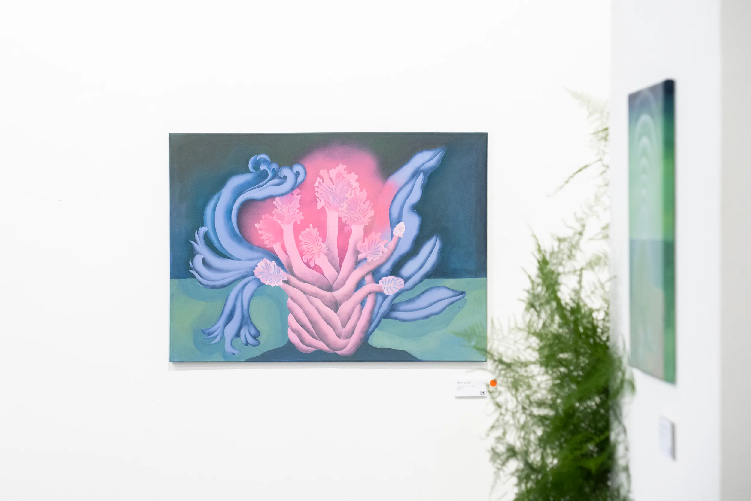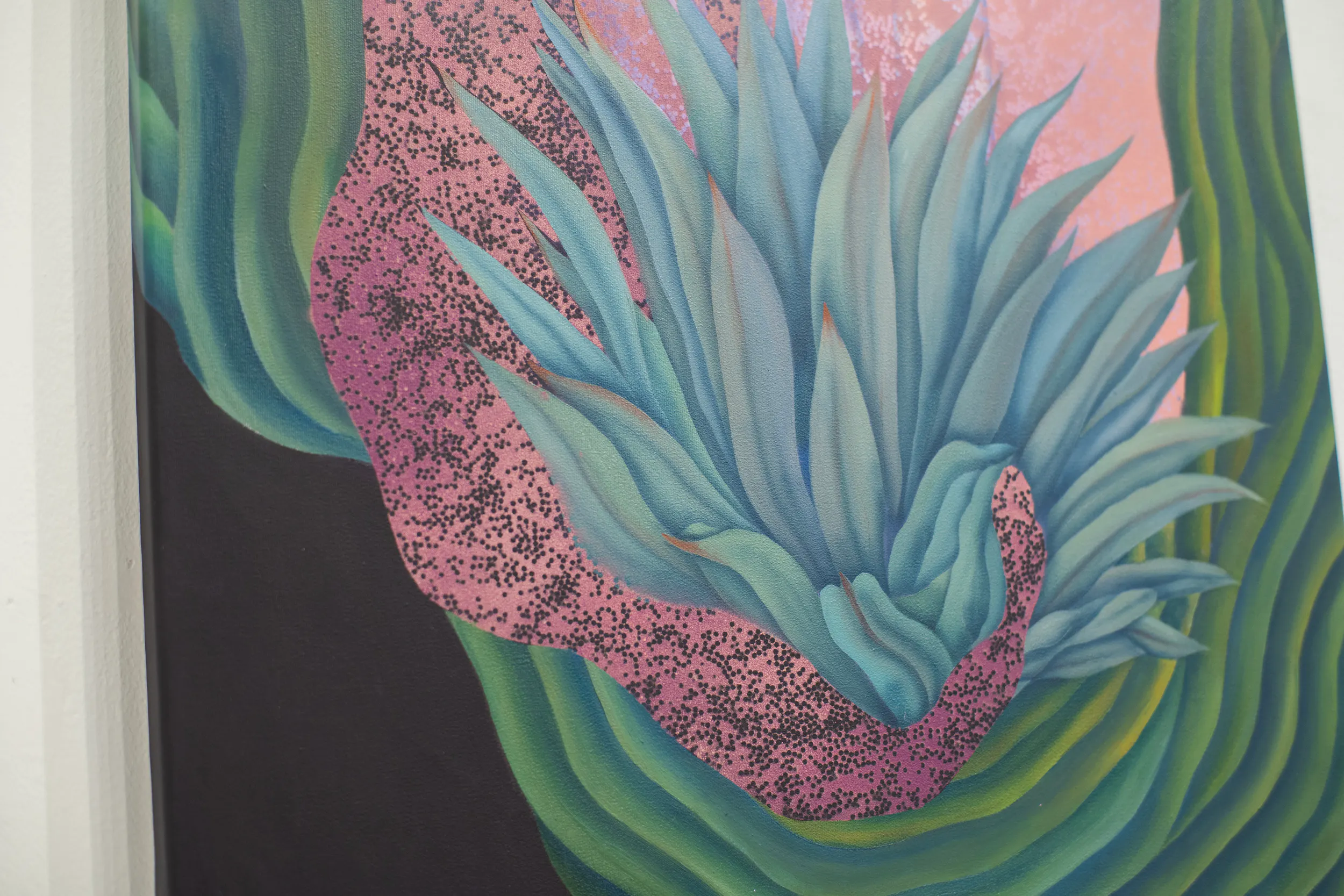 Kovács Gabriella Agavé című kiállítása egy különleges, saját szabályai szerint működő képzeletbeli tájba invitálja a látogatót. A festmények középpontjában a növényi formák, a természet organikus ritmusai és az ezekből kialakuló, álomszerű terek állnak. Gabriella az elmúlt három évben következetesen épített fel egy olyan festői világot, ahol a természet nem háttérként jelenik meg, hanem önálló szereplővé válik: egyszerre védelmező, titokzatos és állandóan változó.