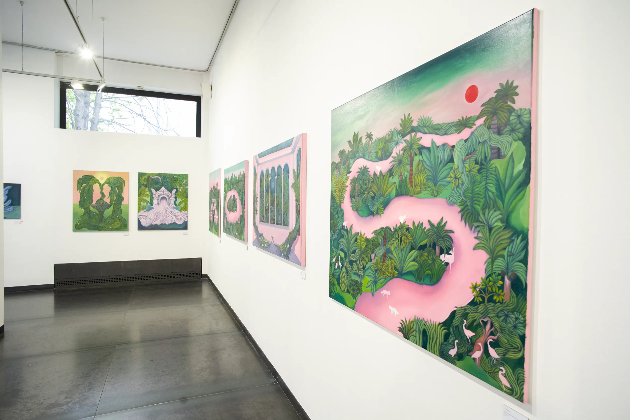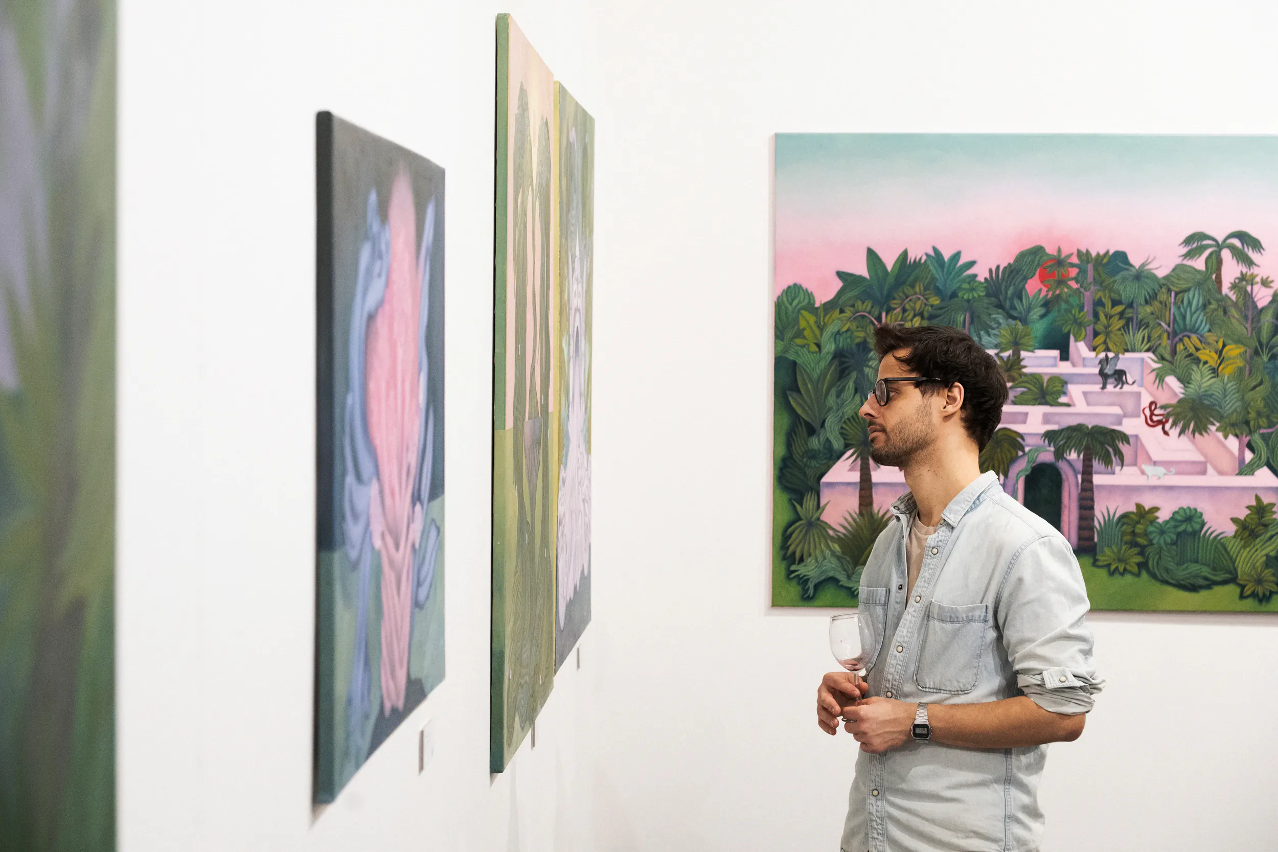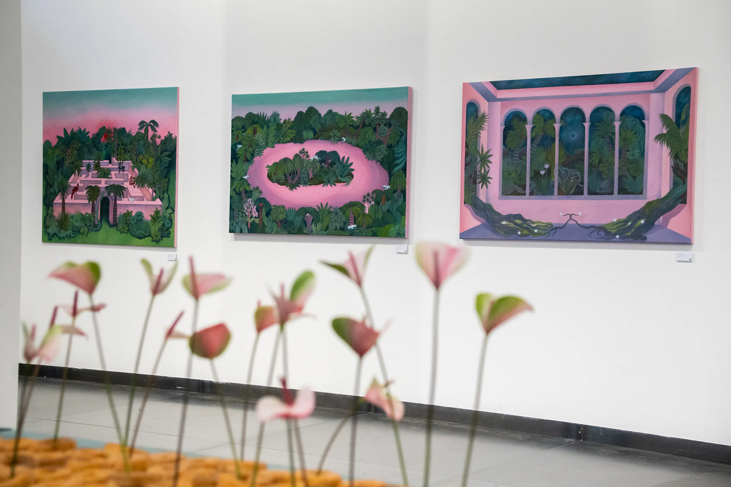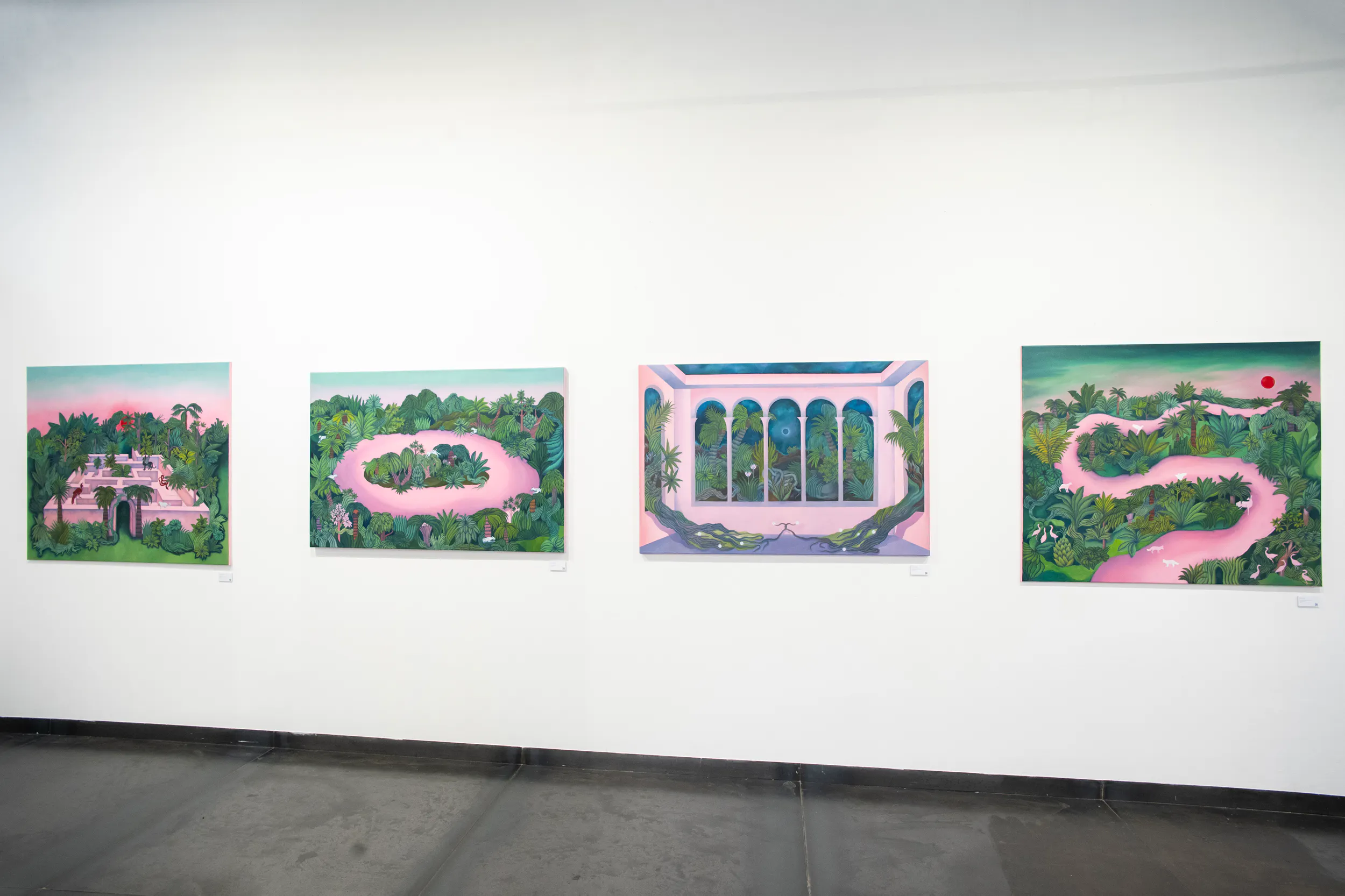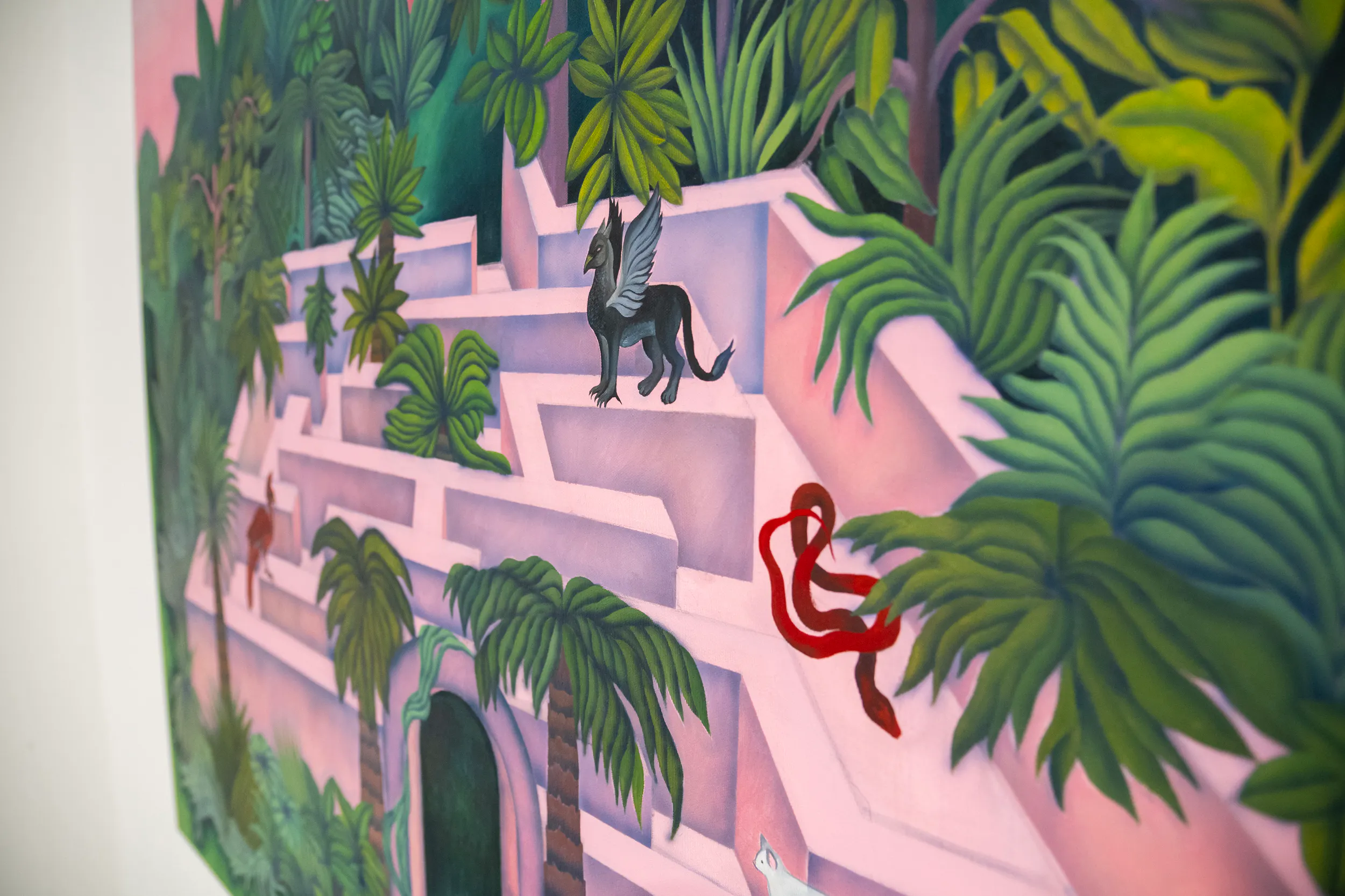 A labirintusok, a pálmaházakat idéző építészeti részletek, a kanyargó rózsaszín vízfelületek és a növényi csápokra emlékeztető formák mind egy belső utazás állomásai. Gabriella képei lassú szemlélődésre hívnak: arra, hogy a néző saját tempójában fedezze fel a részleteket, és engedje, hogy a festmények atmoszférája fokozatosan bontakozzon ki.
