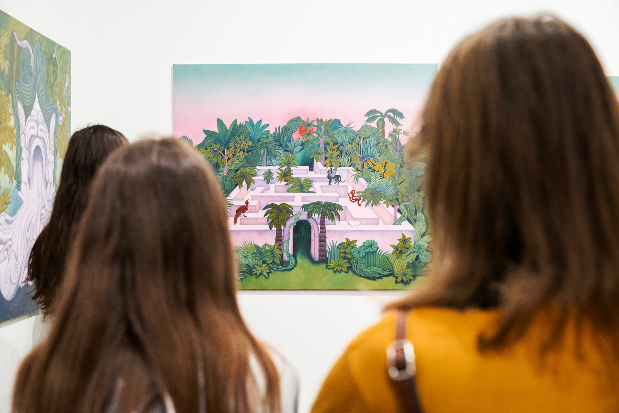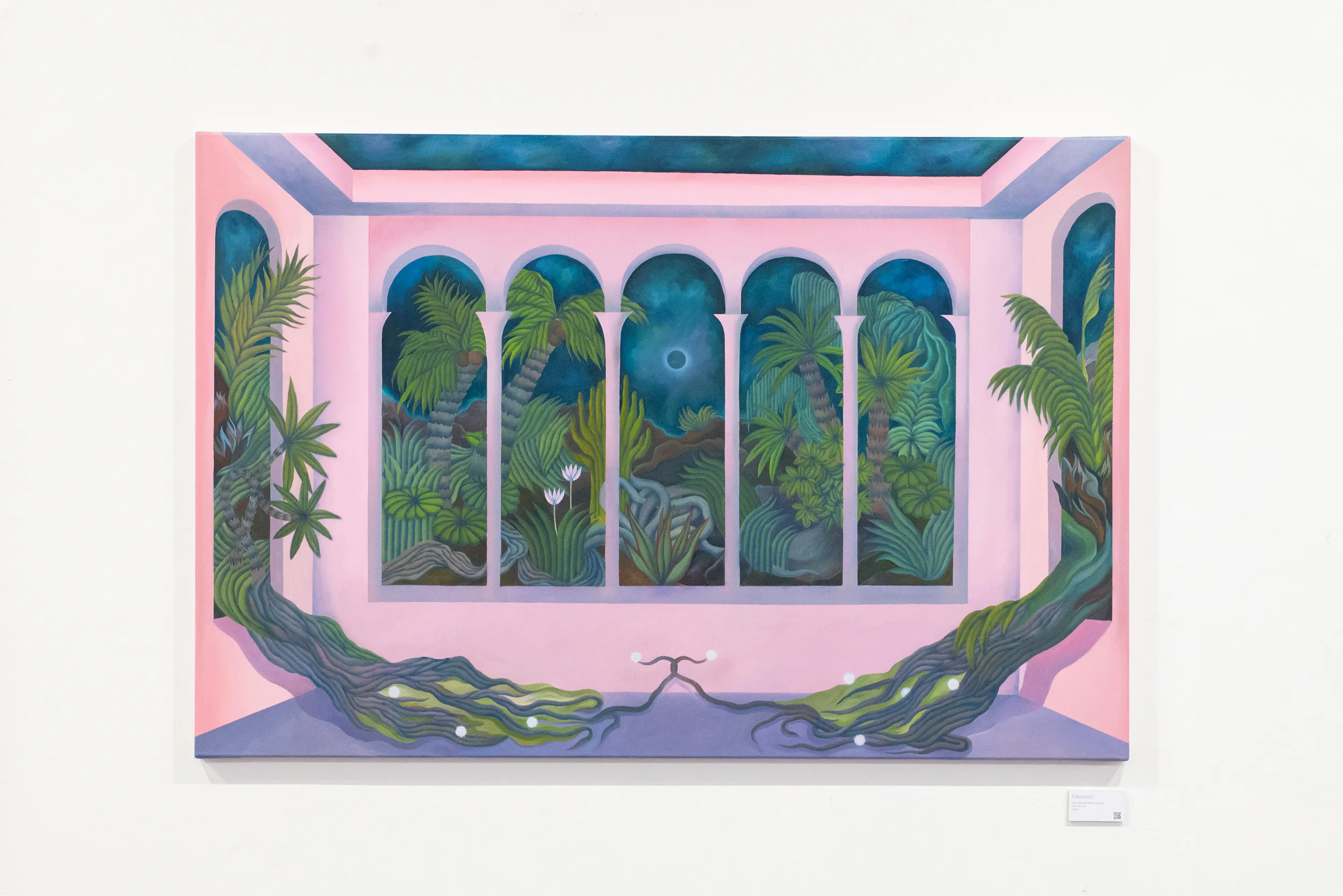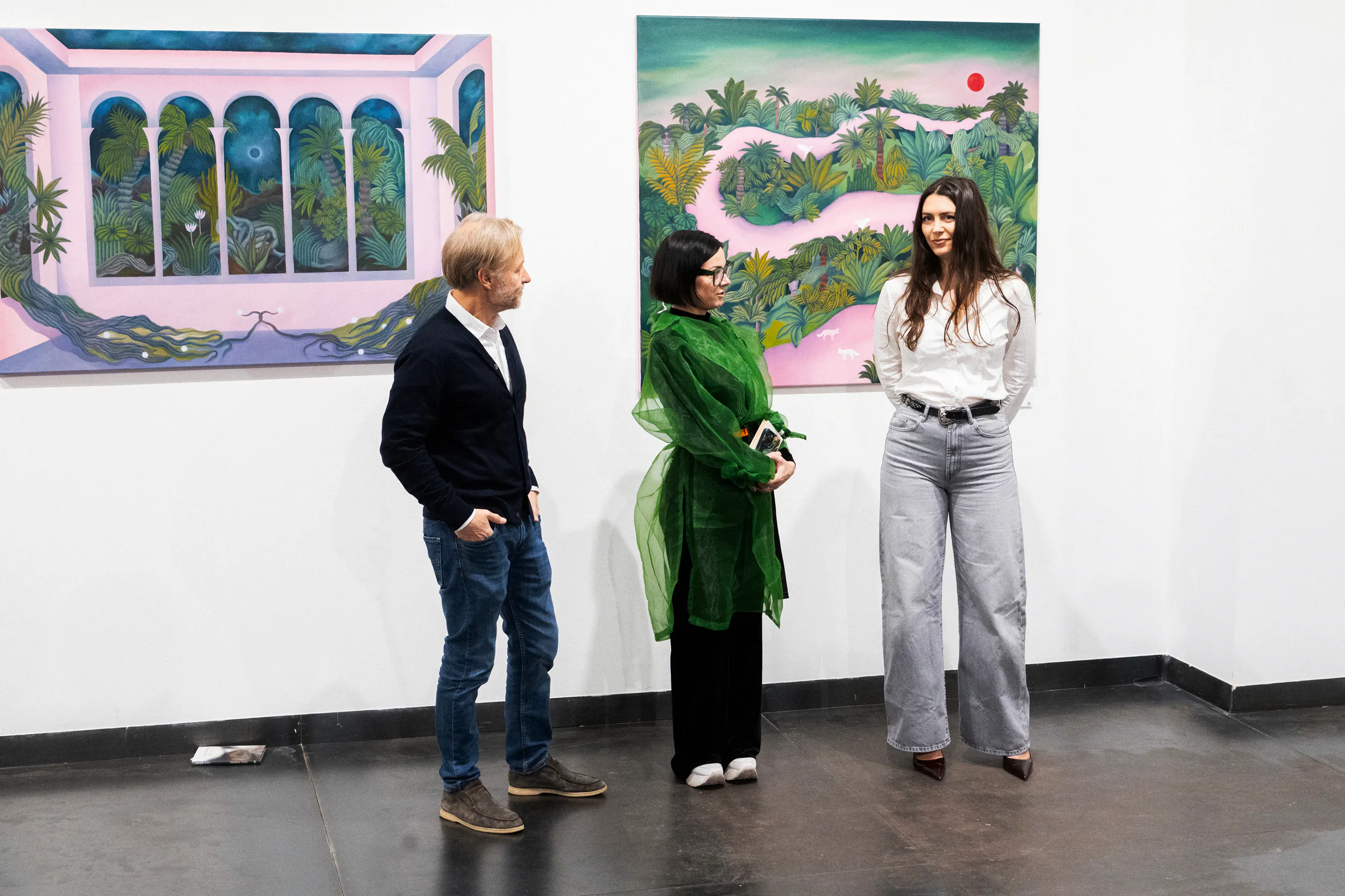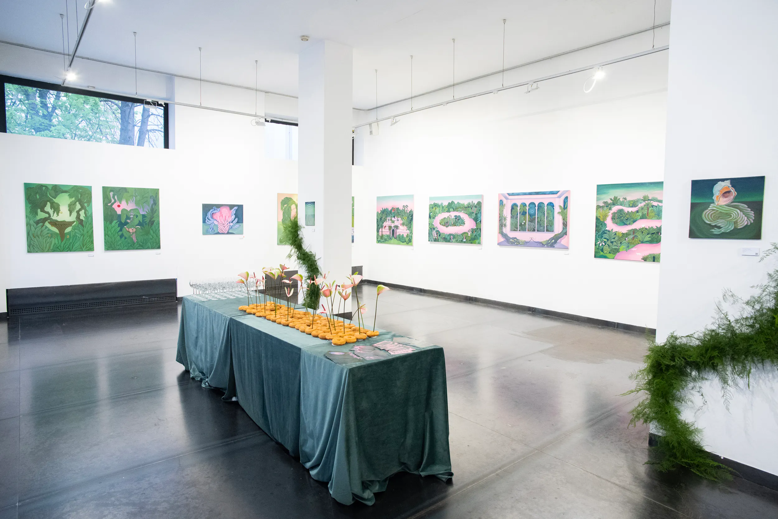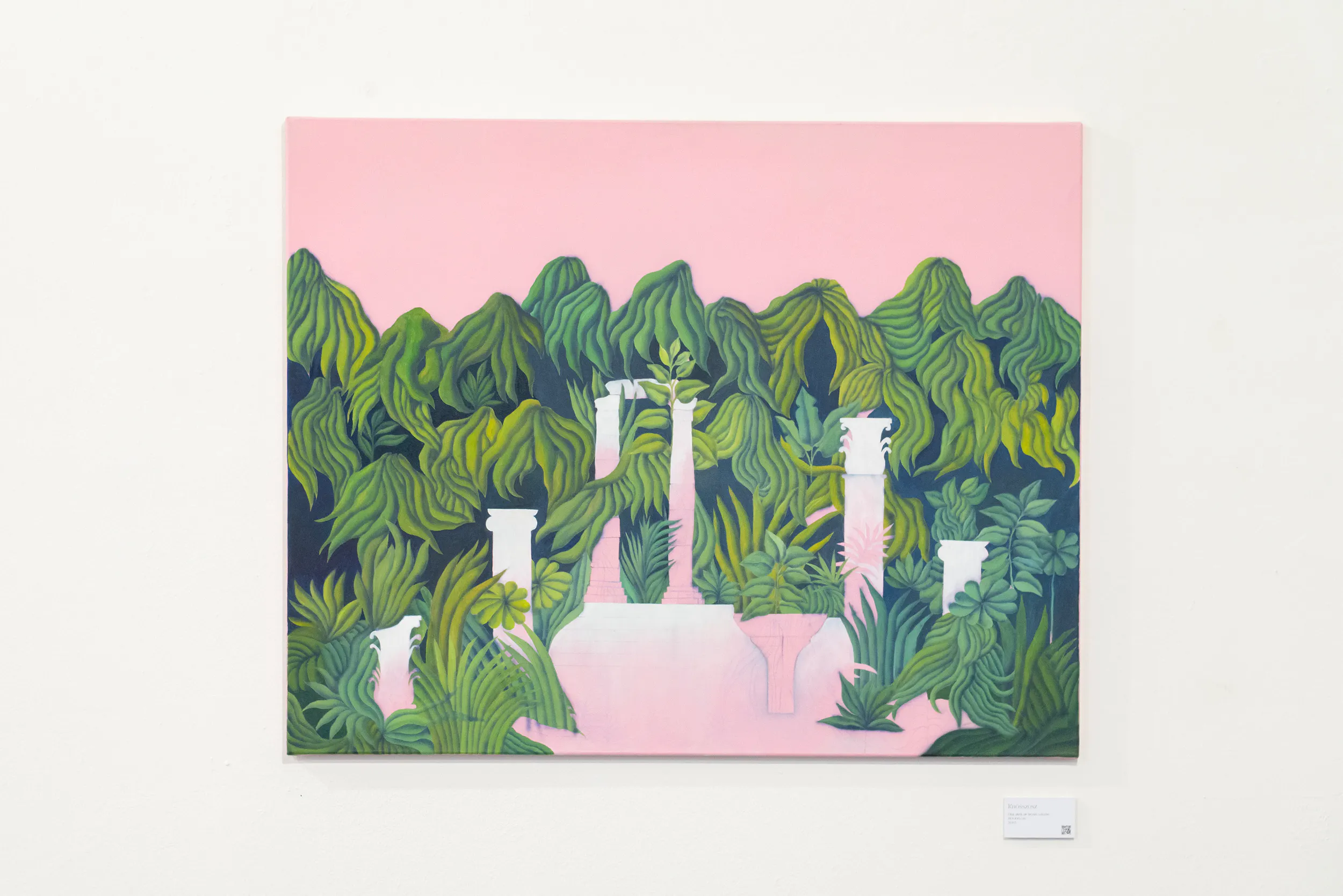 A labirintusok, a pálmaházakat idéző építészeti részletek, a kanyargó rózsaszín vízfelületek és a növényi csápokra emlékeztető formák mind egy belső utazás állomásai. Gabriella képei lassú szemlélődésre hívnak: arra, hogy a néző saját tempójában fedezze fel a részleteket, és engedje, hogy a festmények atmoszférája fokozatosan bontakozzon ki.