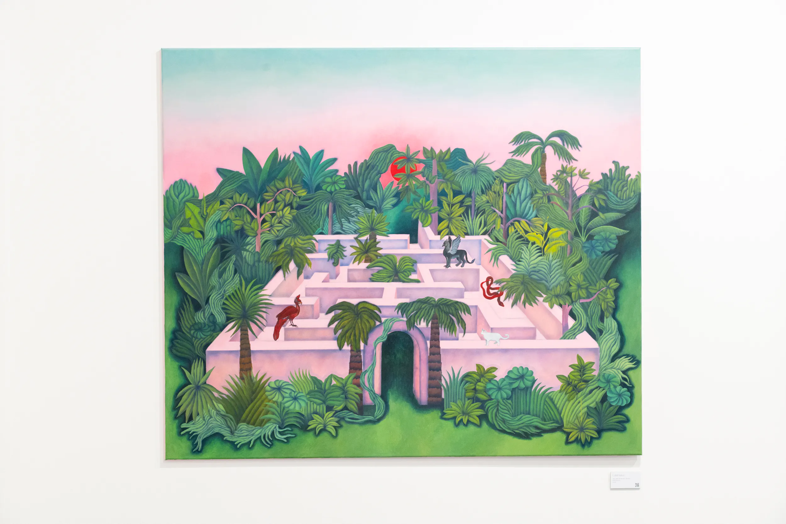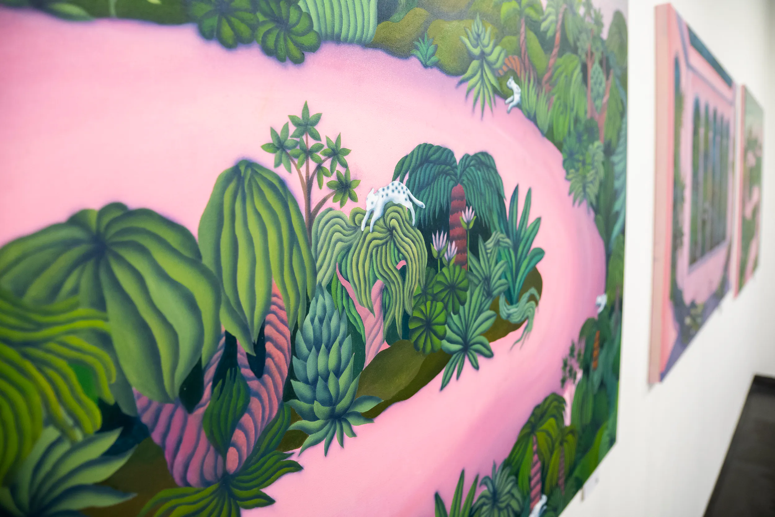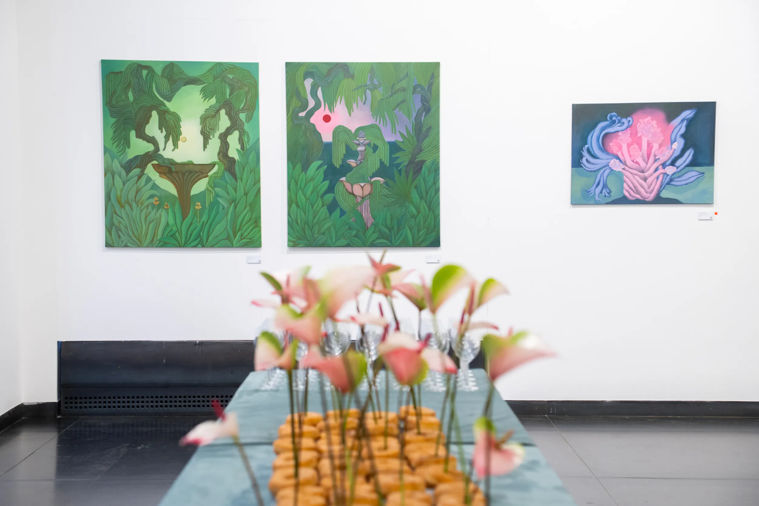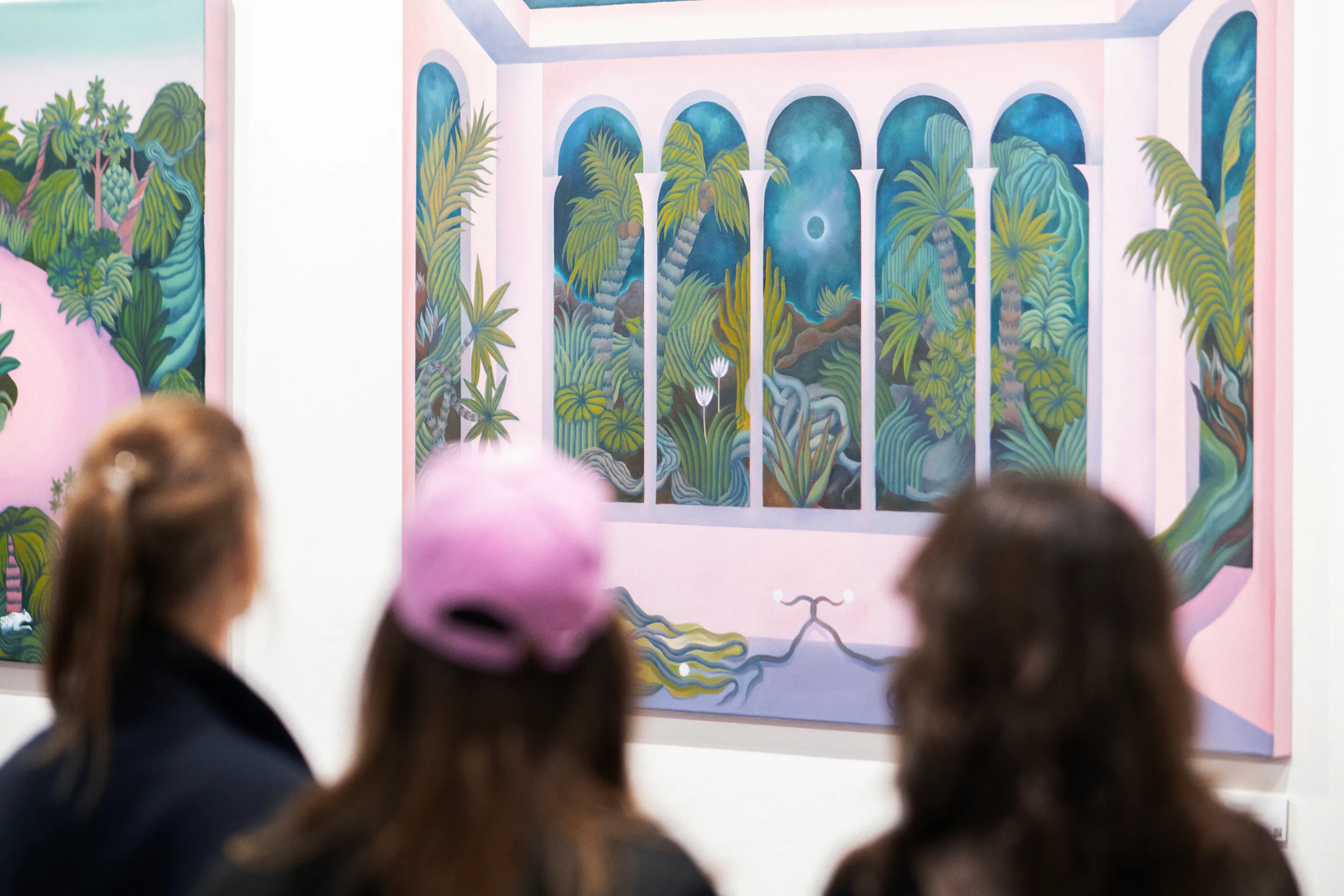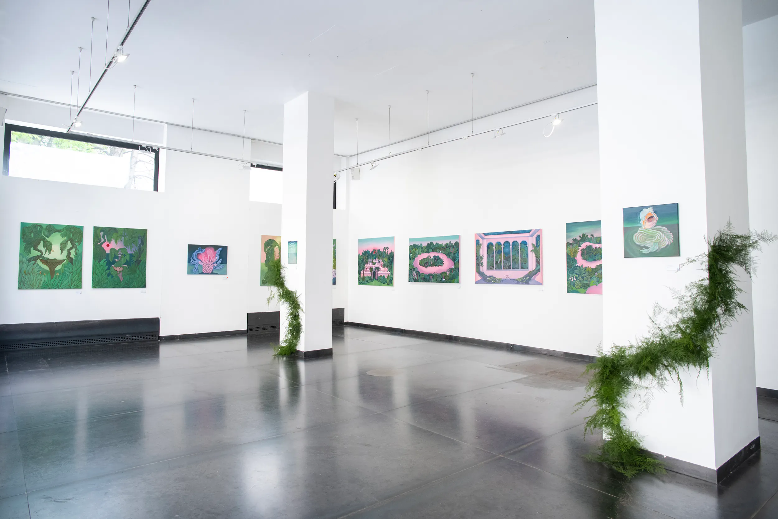 A labirintusok, a pálmaházakat idéző építészeti részletek, a kanyargó rózsaszín vízfelületek és a növényi csápokra emlékeztető formák mind egy belső utazás állomásai. Gabriella képei lassú szemlélődésre hívnak: arra, hogy a néző saját tempójában fedezze fel a részleteket, és engedje, hogy a festmények atmoszférája fokozatosan bontakozzon ki.