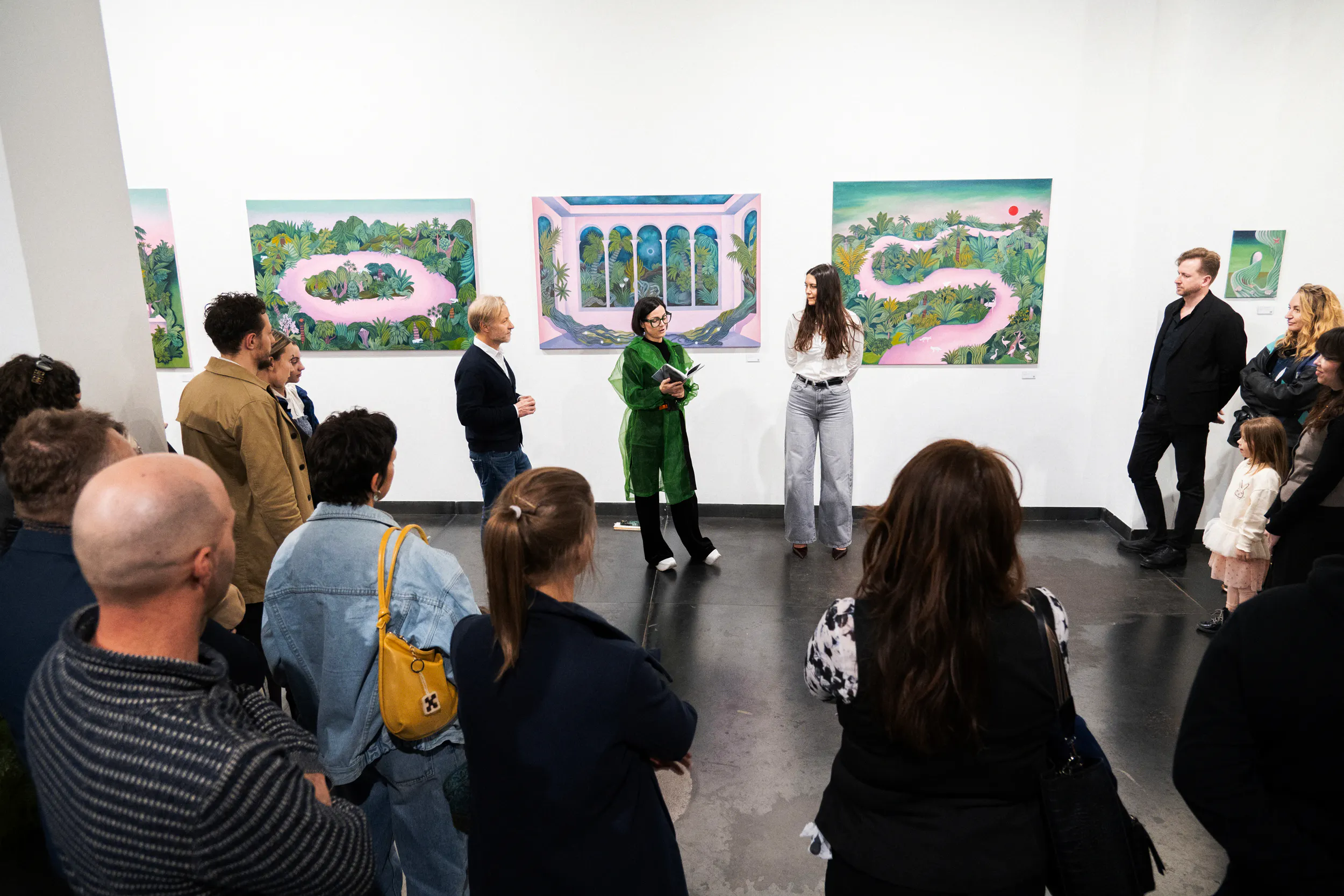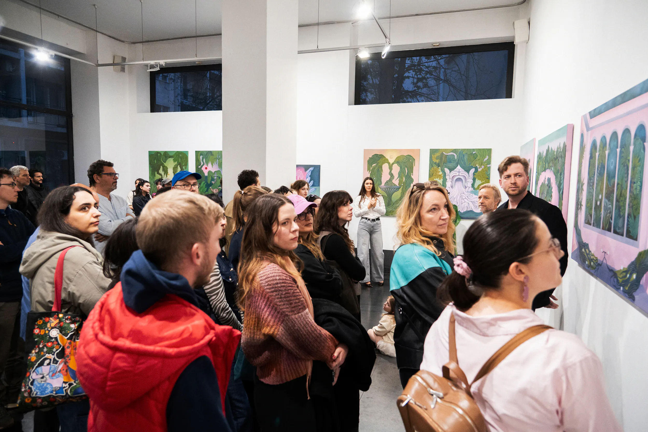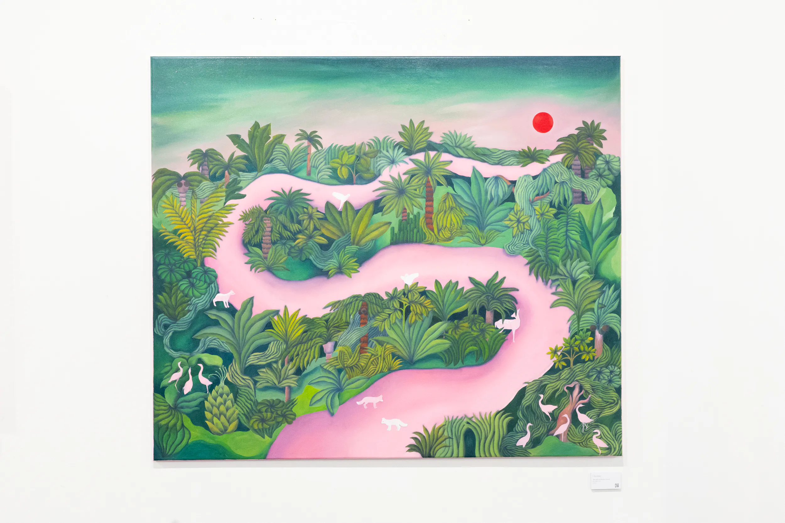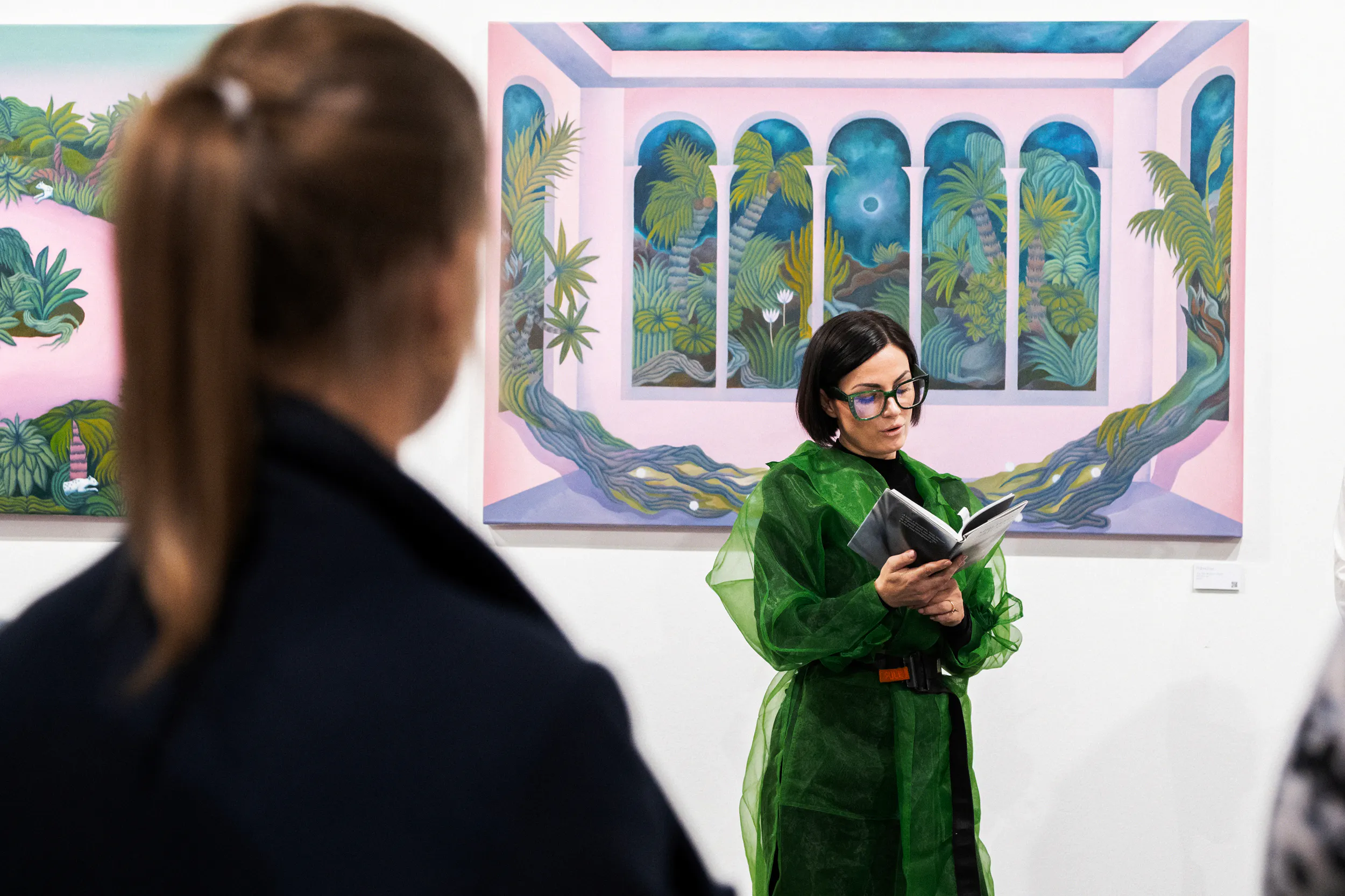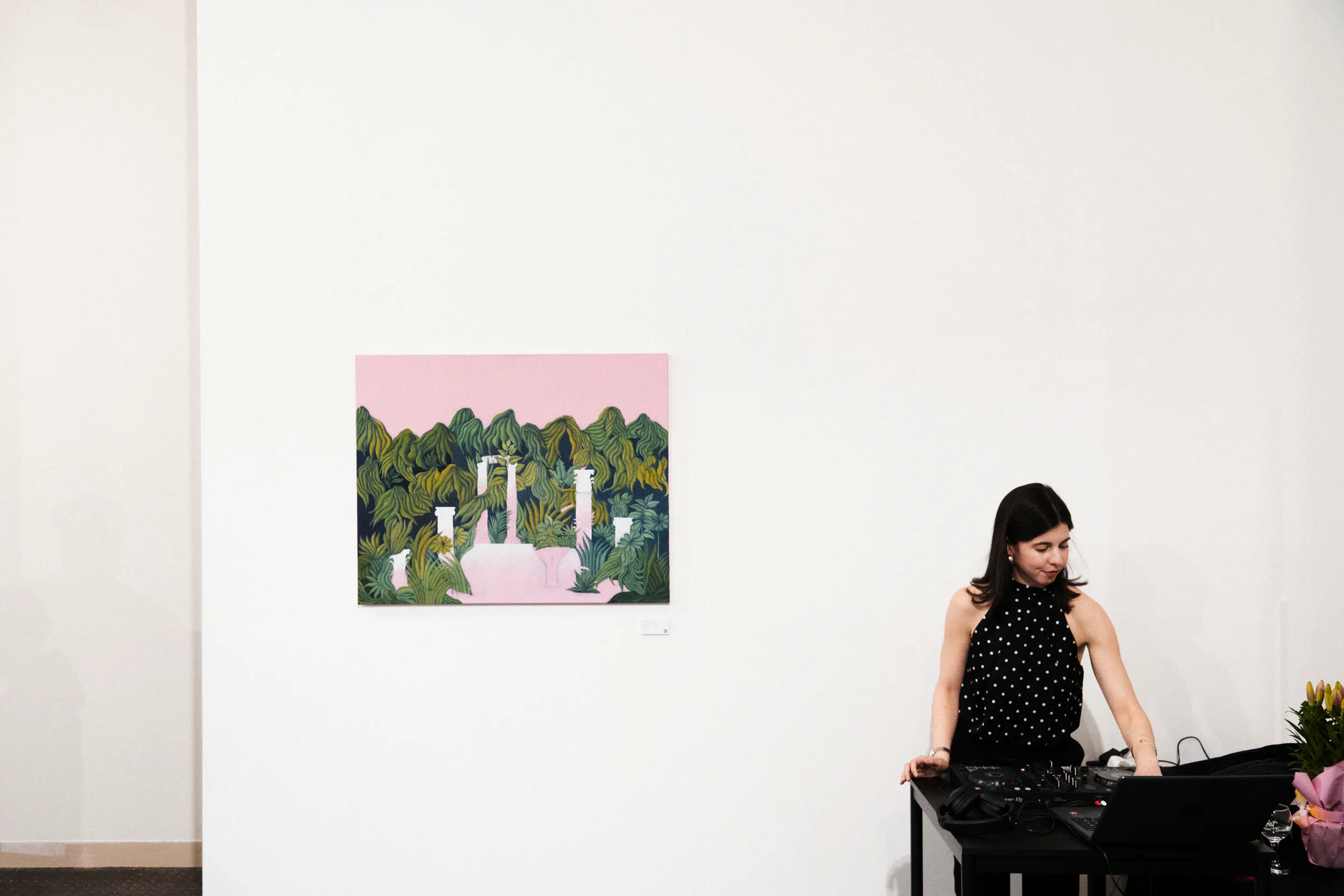 A labirintusok, a pálmaházakat idéző építészeti részletek, a kanyargó rózsaszín vízfelületek és a növényi csápokra emlékeztető formák mind egy belső utazás állomásai. Gabriella képei lassú szemlélődésre hívnak: arra, hogy a néző saját tempójában fedezze fel a részleteket, és engedje, hogy a festmények atmoszférája fokozatosan bontakozzon ki.