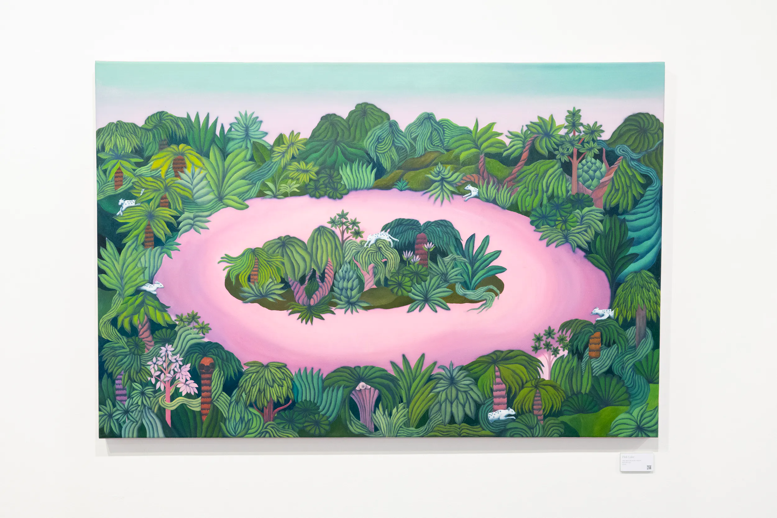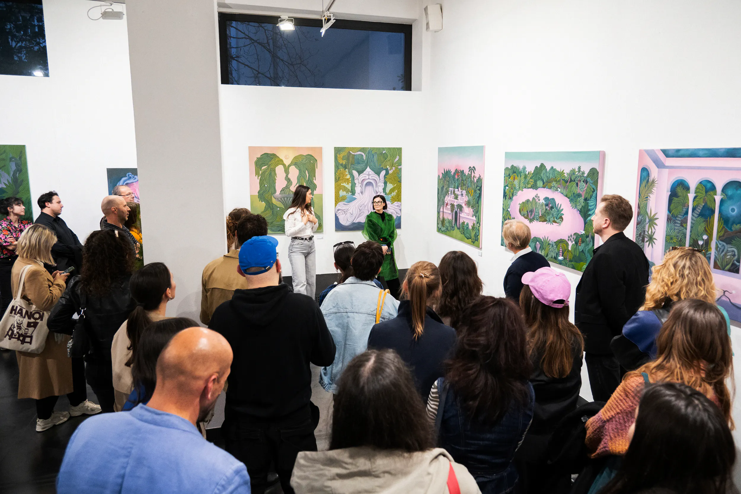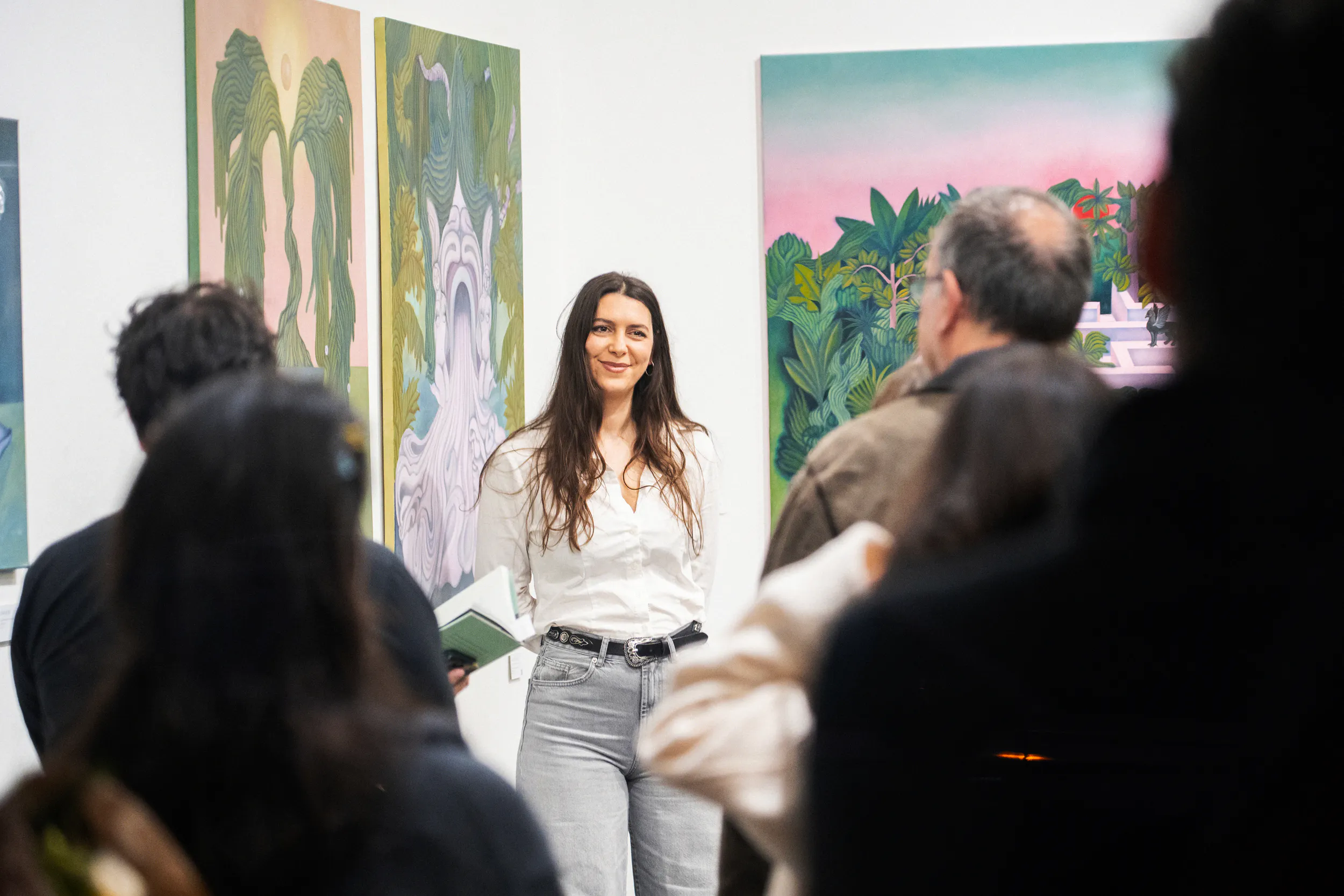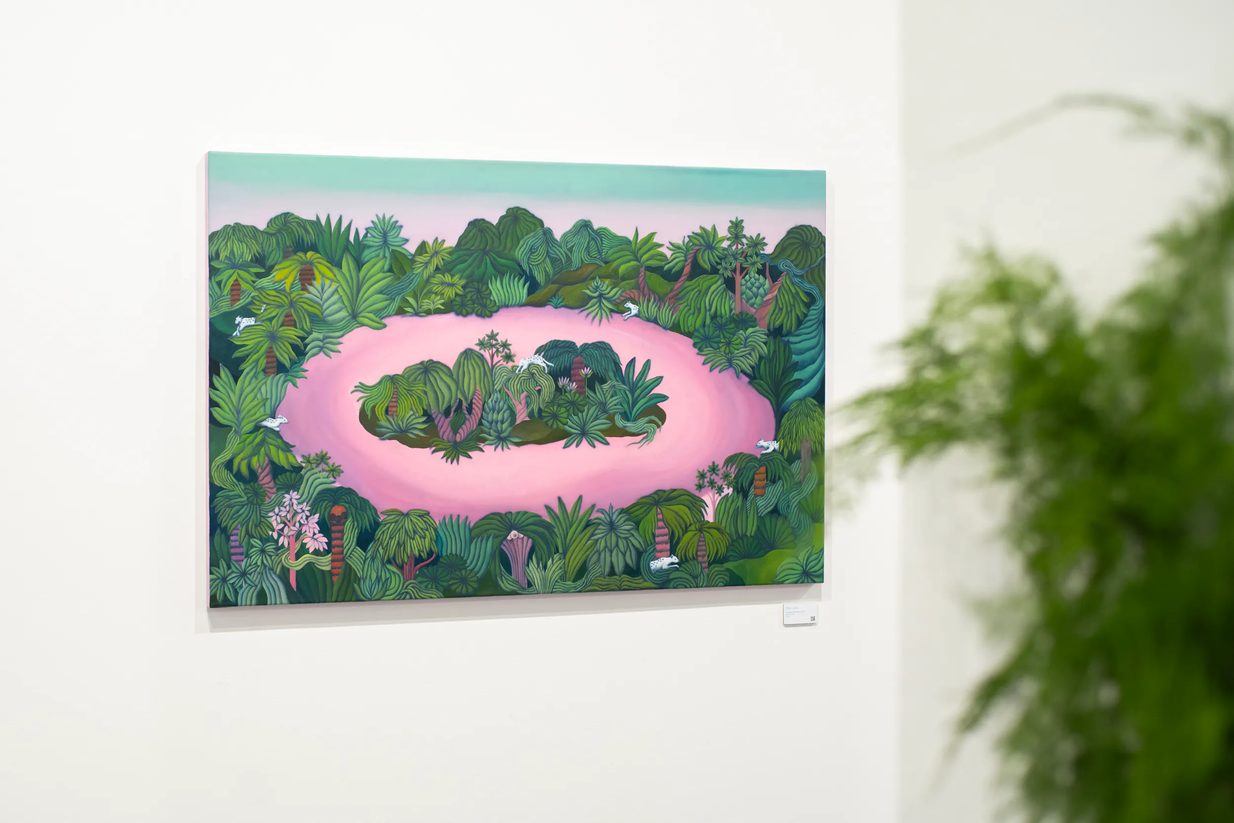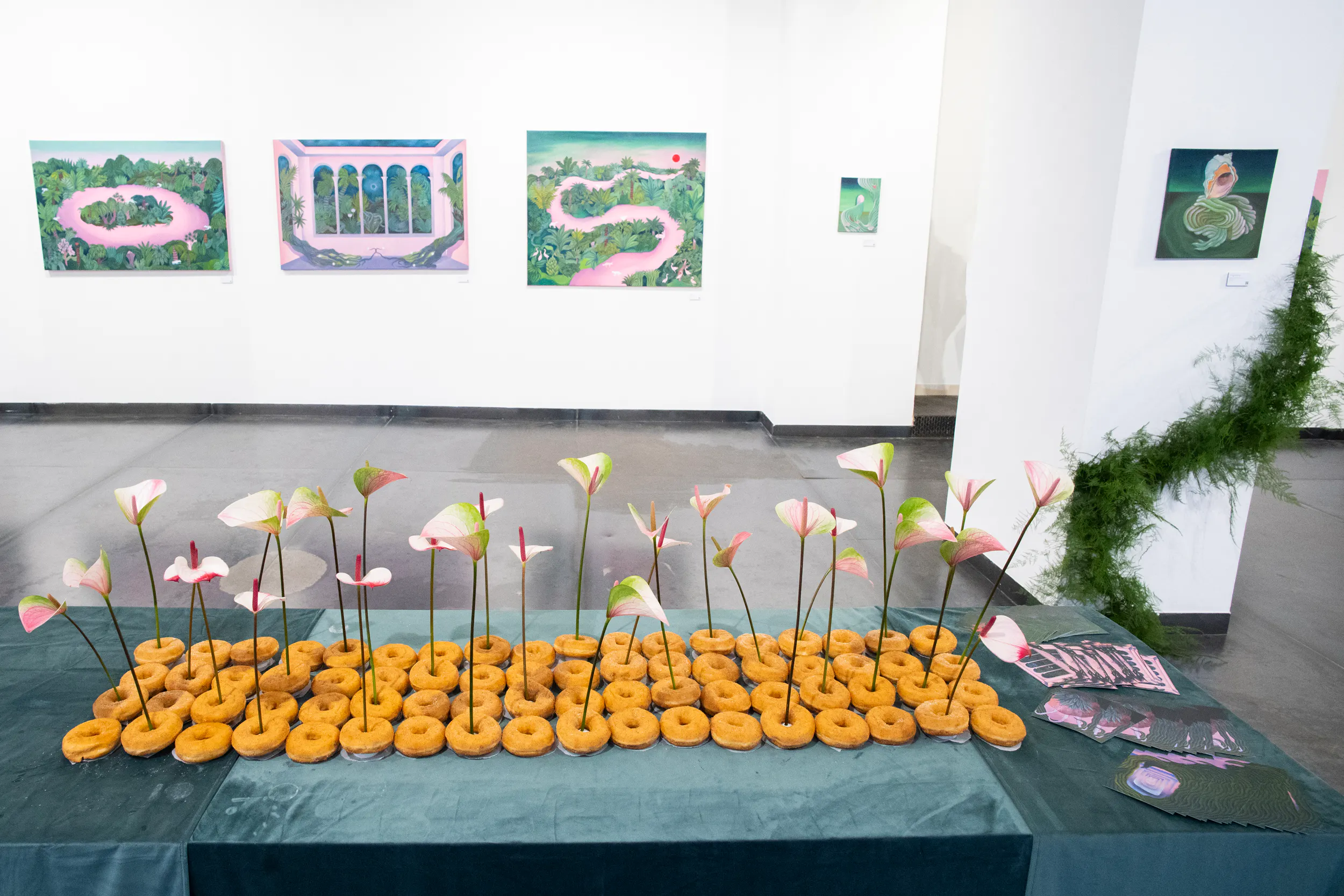 A labirintusok, a pálmaházakat idéző építészeti részletek, a kanyargó rózsaszín vízfelületek és a növényi csápokra emlékeztető formák mind egy belső utazás állomásai. Gabriella képei lassú szemlélődésre hívnak: arra, hogy a néző saját tempójában fedezze fel a részleteket, és engedje, hogy a festmények atmoszférája fokozatosan bontakozzon ki.