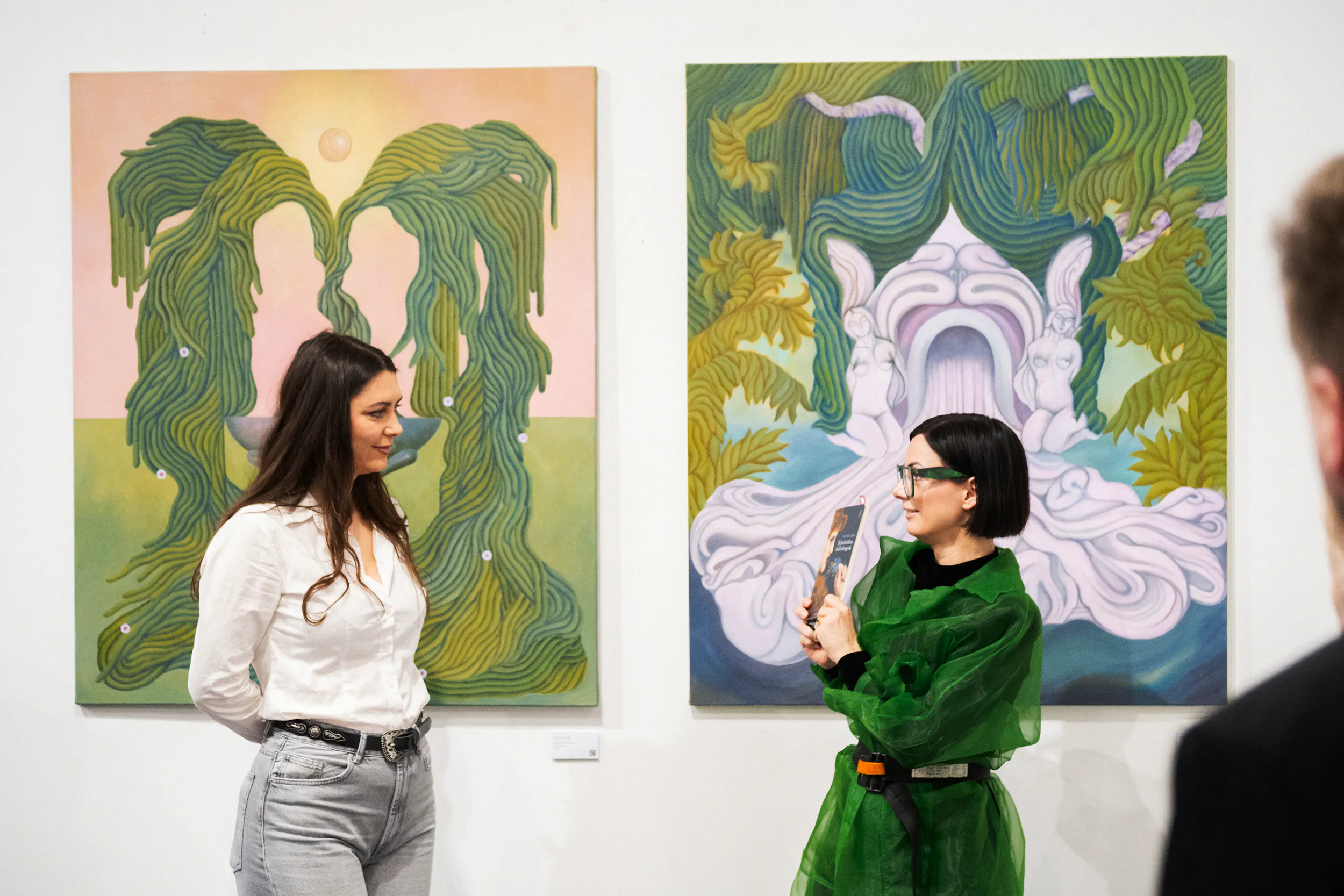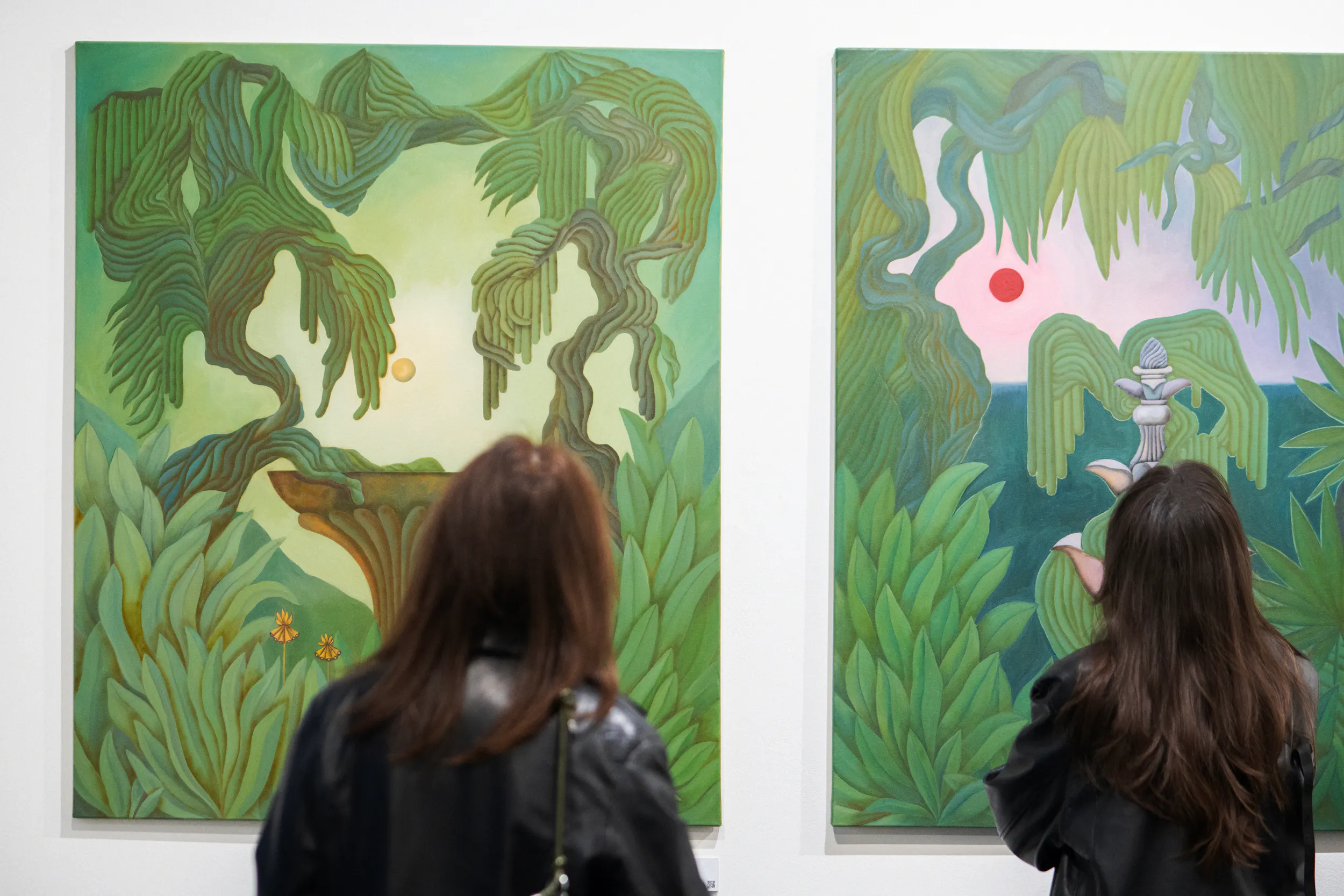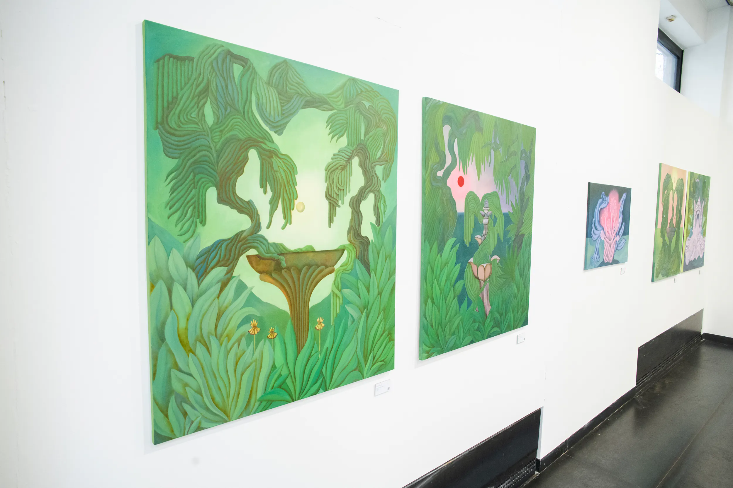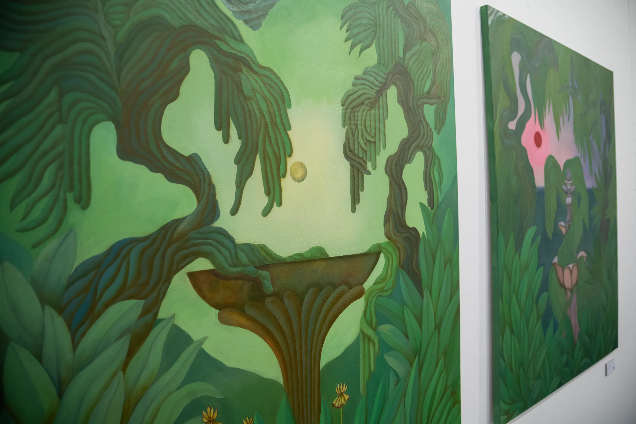 A festmények világát erőteljes színek, elsősorban a zöld és a rózsaszín árnyalatai határozzák meg. Ezek a tónusok nem a természet valóságos leképezésére törekednek, hanem egy különleges, érzelmileg telített hangulatot teremtenek. A néző úgy érezheti, mintha egy egyszerre ismerős és idegen helyre lépne, ahol a valóság és a képzelet határa elmosódik.