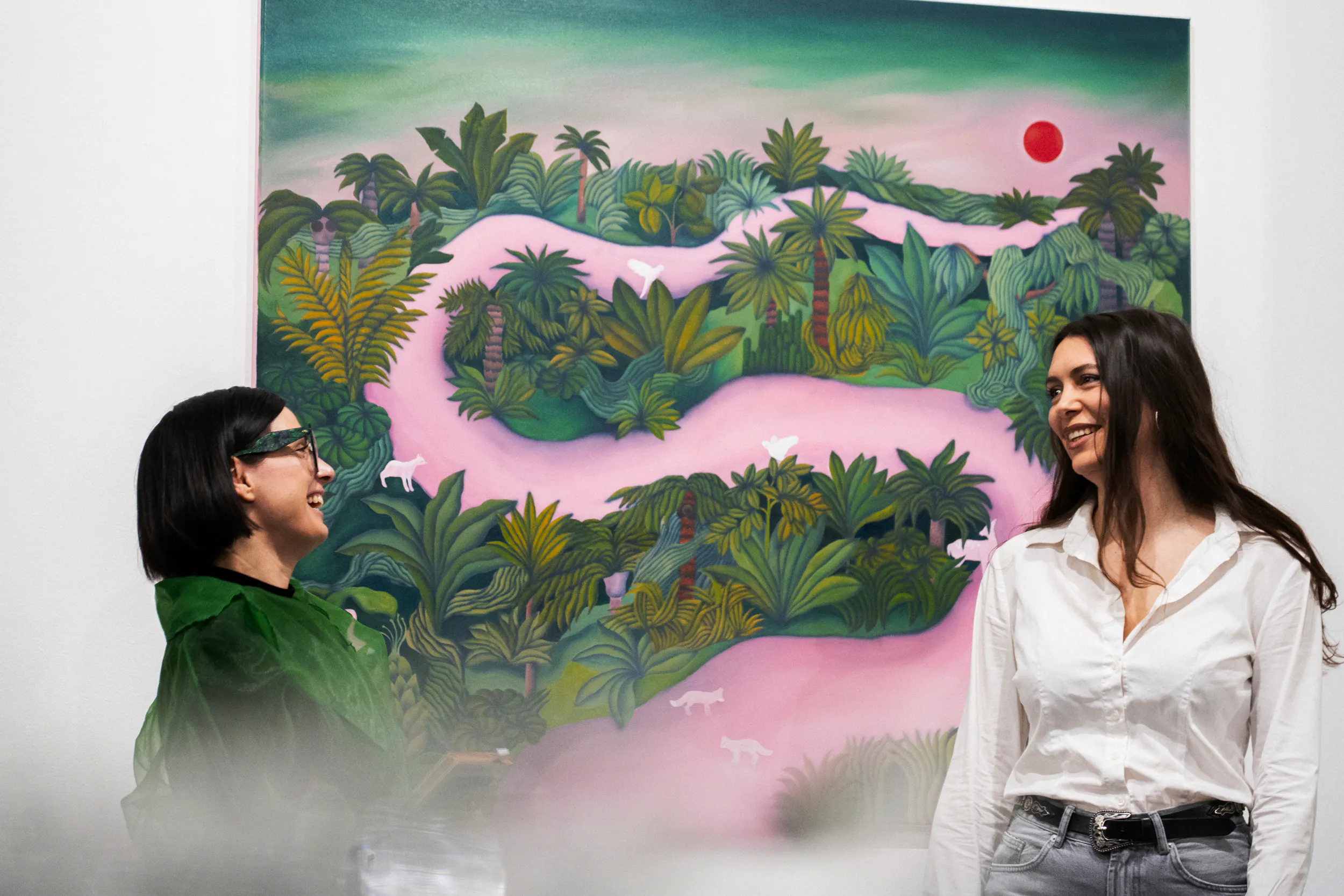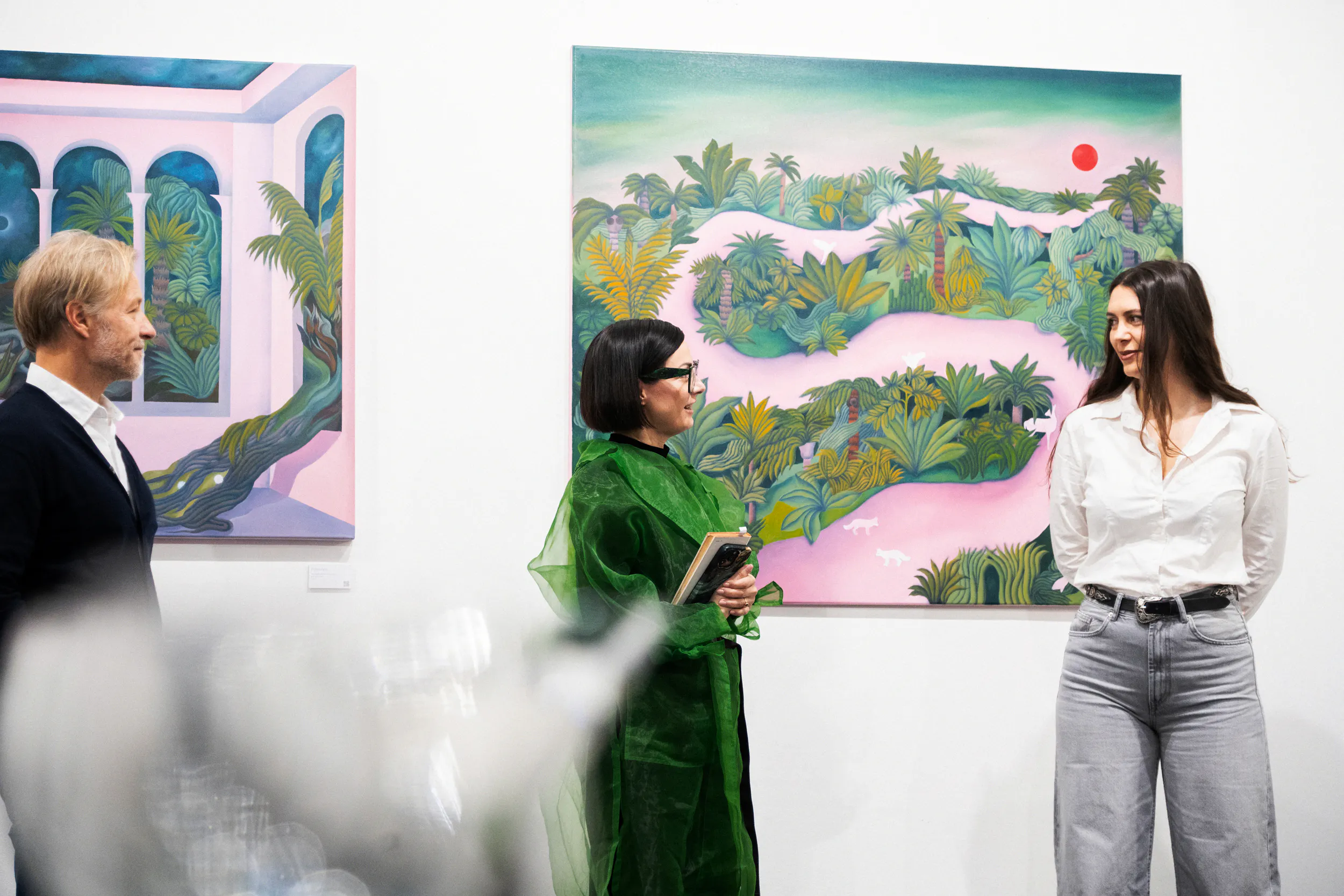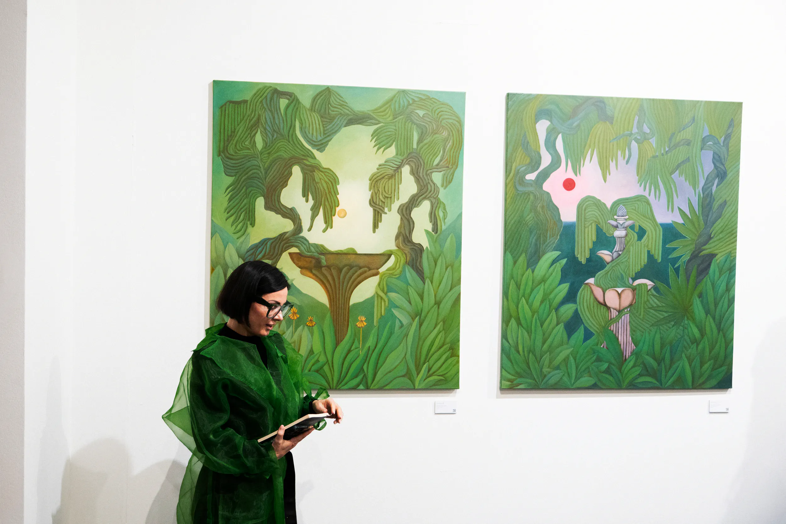 A festmények világát erőteljes színek, elsősorban a zöld és a rózsaszín árnyalatai határozzák meg. Ezek a tónusok nem a természet valóságos leképezésére törekednek, hanem egy különleges, érzelmileg telített hangulatot teremtenek. A néző úgy érezheti, mintha egy egyszerre ismerős és idegen helyre lépne, ahol a valóság és a képzelet határa elmosódik.
