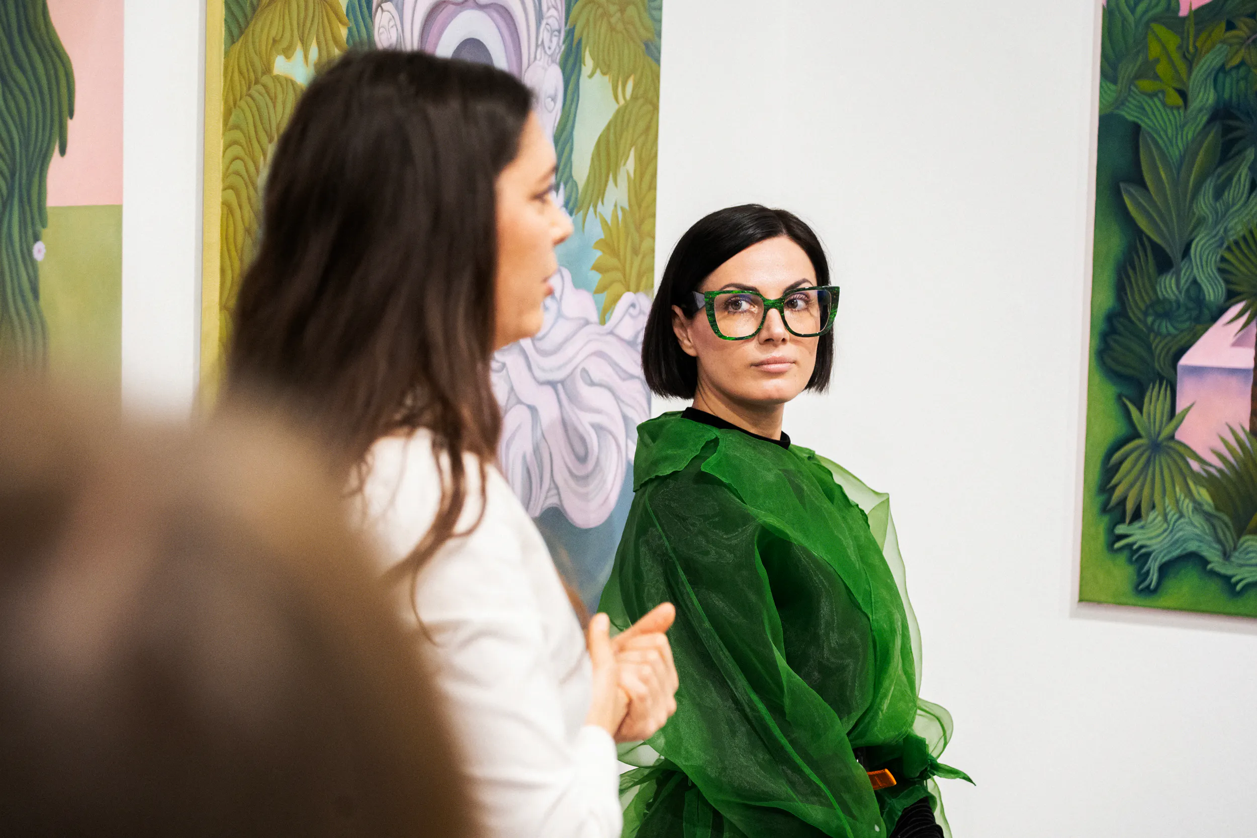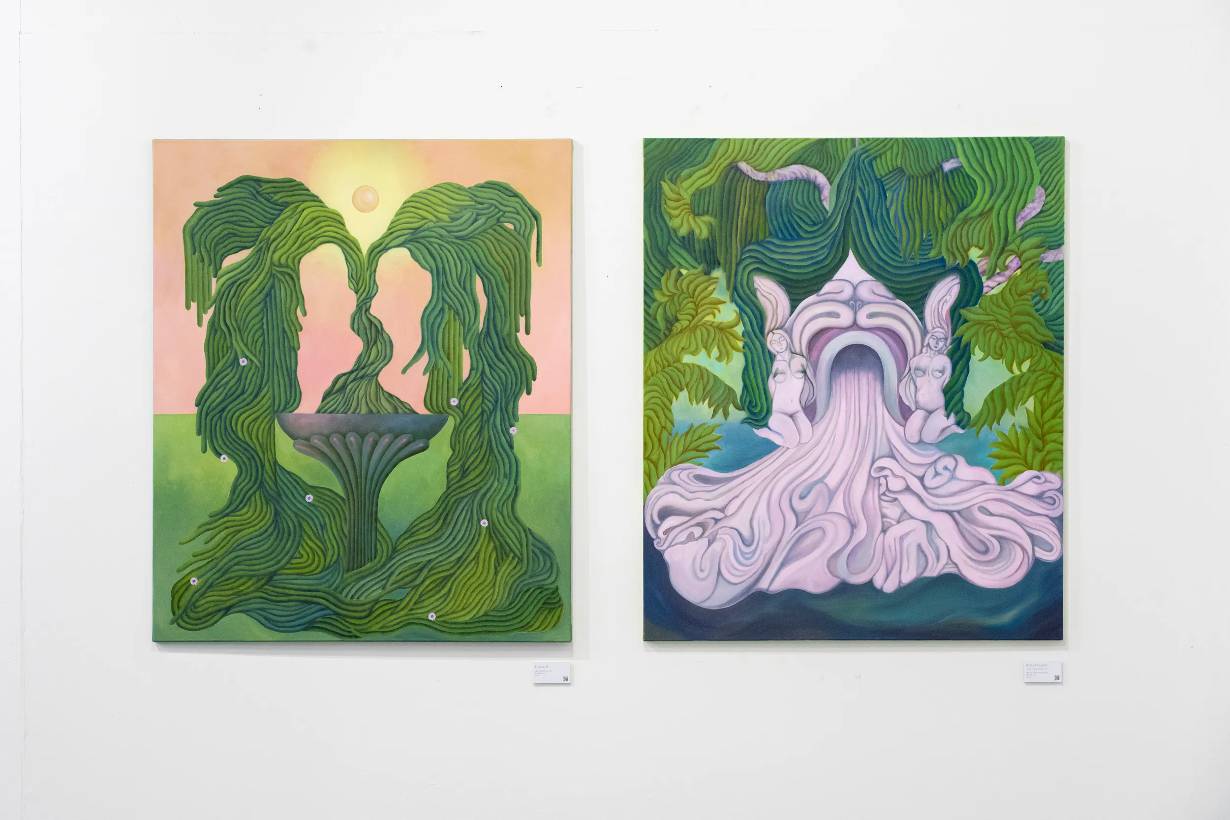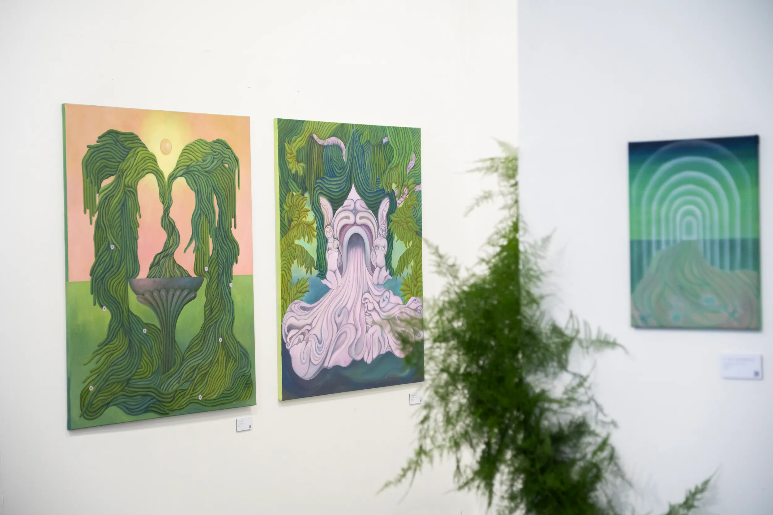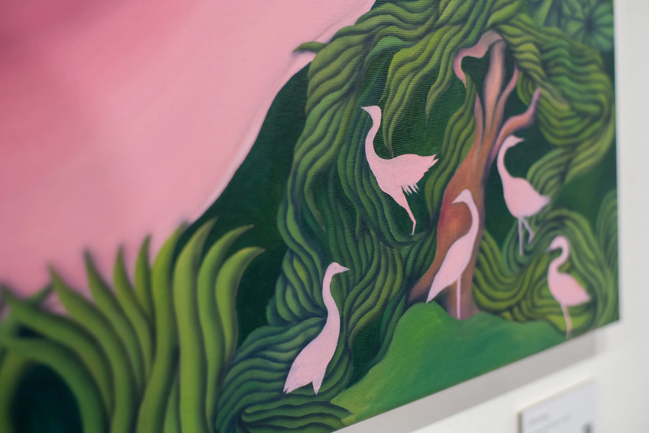 A festmények világát erőteljes színek, elsősorban a zöld és a rózsaszín árnyalatai határozzák meg. Ezek a tónusok nem a természet valóságos leképezésére törekednek, hanem egy különleges, érzelmileg telített hangulatot teremtenek. A néző úgy érezheti, mintha egy egyszerre ismerős és idegen helyre lépne, ahol a valóság és a képzelet határa elmosódik.