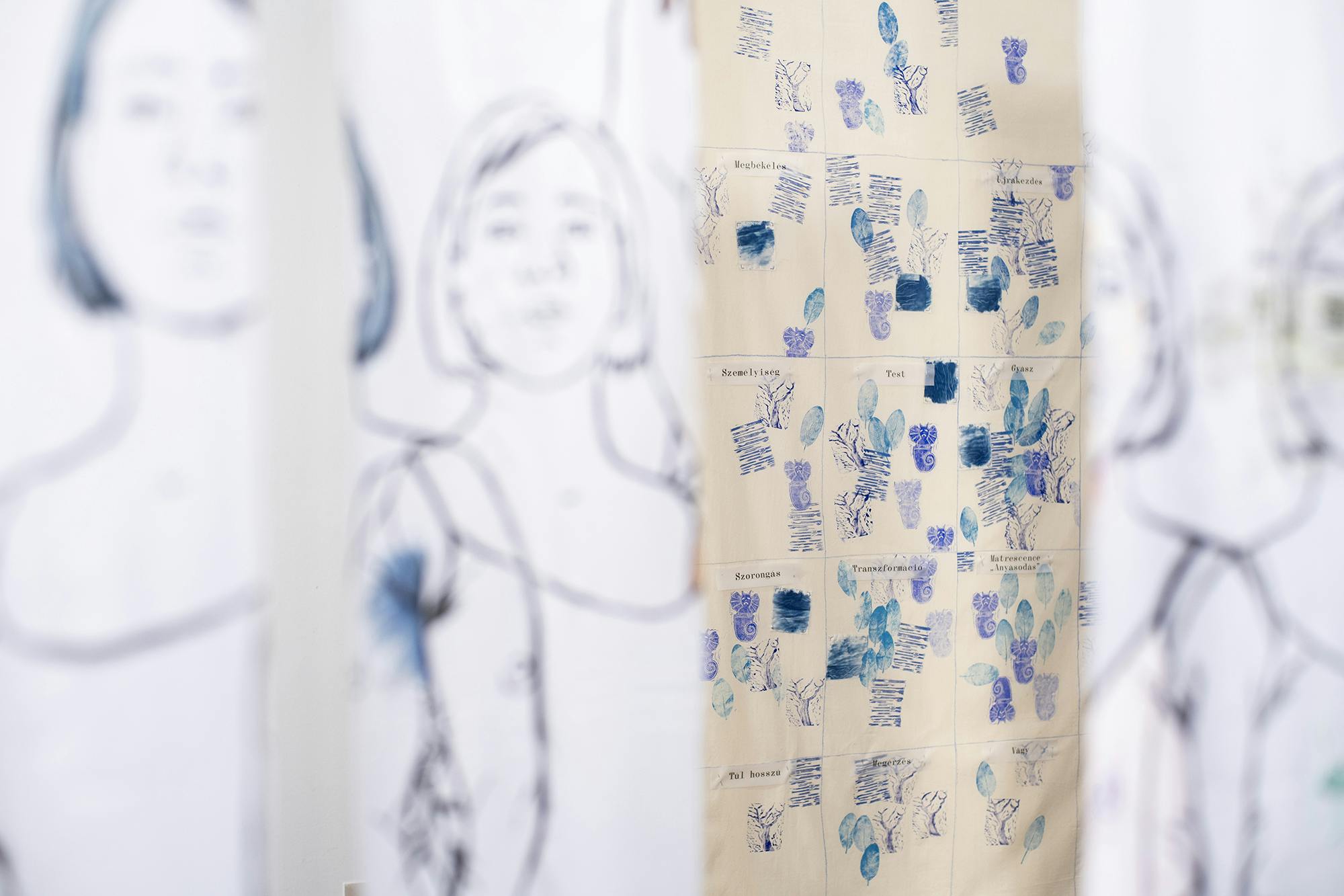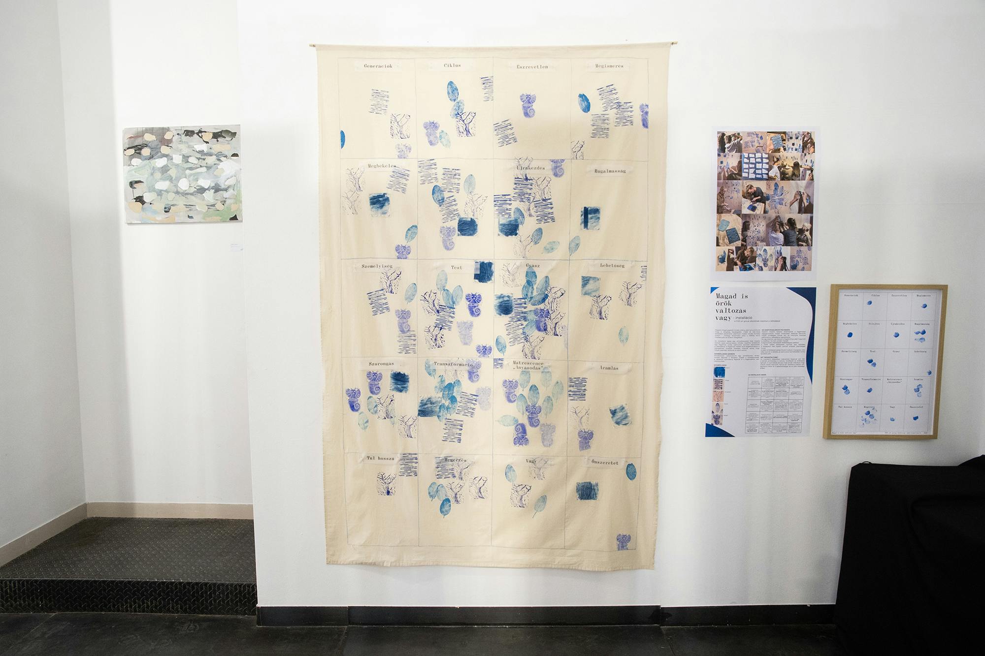 A kiállítás szívében egy közös installáció is helyet kap. Ez a monumentális textilmű az adatvizualizációs grafikákhoz hasonló módon jeleníti meg az alkotók és a változás viszonyrendszerét. A molinóra varrt rácsháló 20 mezője különféle fogalmakhoz – gyász, újrakezdés, rugalmasság, intuíció, test, megbékélés – kapcsolódik, és mindegyikben a művészek egyéni jelei, motívumai tűnnek fel. A jelek helye és ismétlődése az adott tapasztalat fontosságát, intenzitását mutatja meg, így a közös mű egyszerre személyes térkép és kollektív napló. Az installáció kiegészítéseként a kiállítás látogatói is részeseivé válhatnak a folyamatnak: egy kisebb vásznon saját jeleiket helyezhetik el, így hozzájárulva egy közös, interaktív műtárgy megszületéséhez. Az alkotás így nem zárul le a kiállítás megnyitóján, hanem folyamatosan bővül és alakul, ahogy a közönség lenyomatokat hagy benne.